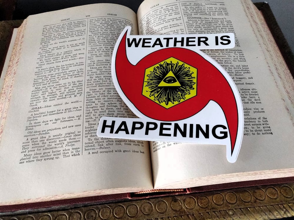 VINYL WEATHER PROOF STICKER, THS HANDSOME 5.15" x 6" ADHESIVE EMBLEM WILL STAND OUT DRAMATICALLY ON NE SURFACE U AFIX IT 2, BOLDLY STATING "WEATHER IS HAPPENING" 2 WHOEVER HAPPENS 2 GAZE UPON IT. SO BIG IT MIGHT B TH ONLY STICKER ON UR LAPTOP. ON UR CAR UR NOW A WEATHER IS HAPPENING AMBASSADOR AS PPL ASK U "WHAT IS WEATHER IS HAPPENING". ON A DOOR, ON A SIGN, THIS STICKER WILL B IN CHARGE. & W/ THES STICKERS U WILL LET EVRE1 KNOW THAT WEATHER IS HAPPENING & HELP SPREAD AWARENESS THT U ND 2 REPENT 2 UR WEATHER LORDS