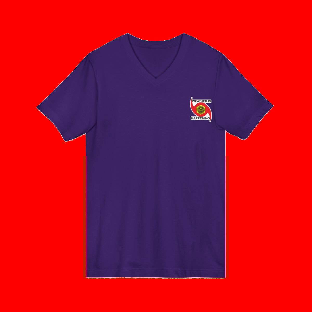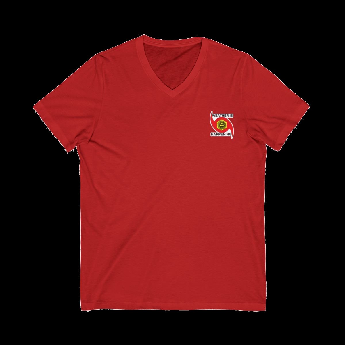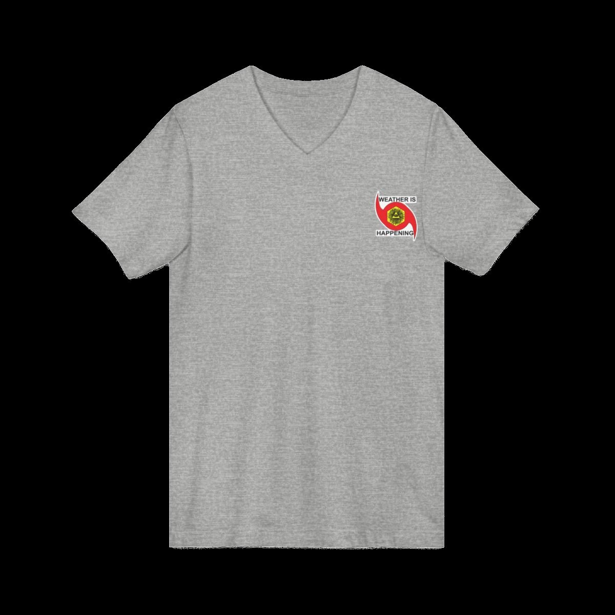 THE WEATHER IS HAPPENING BADGE V-NECK UNISEX T-SHIRT