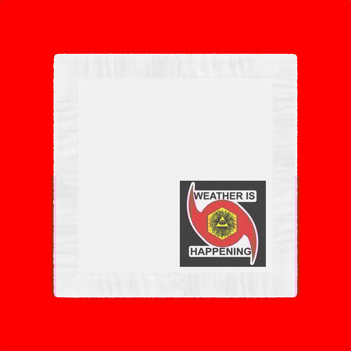 THESE SOFT, THREE-PLY WHITE COINED NAPKINS PROVIDE AN EXCELLENT SURFACE FOR YOU TO BEHOLD THE WEATHER IS HAPPENING LOGO. WITH A SMOOTH TEXTURE AND COINED EDGE BORDERS, THESE NAPKINS ARE PERFECT FOR ANY SOCIAL EVENT LIKE WEDDINGS, BIRTHDAYS, AND BAR MITZVAHS. AVAILABLE IN TWO SIZES: LUNCHEON (6.5" X 6.5") AND BEVERAGE (4.8" X 4.8").