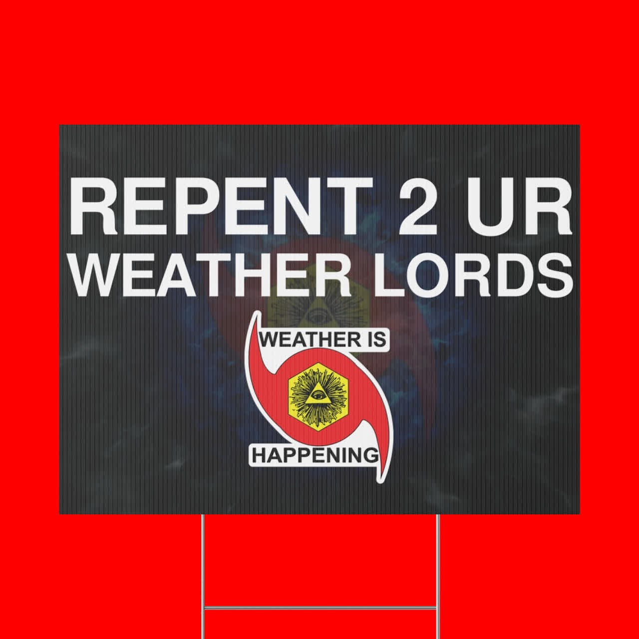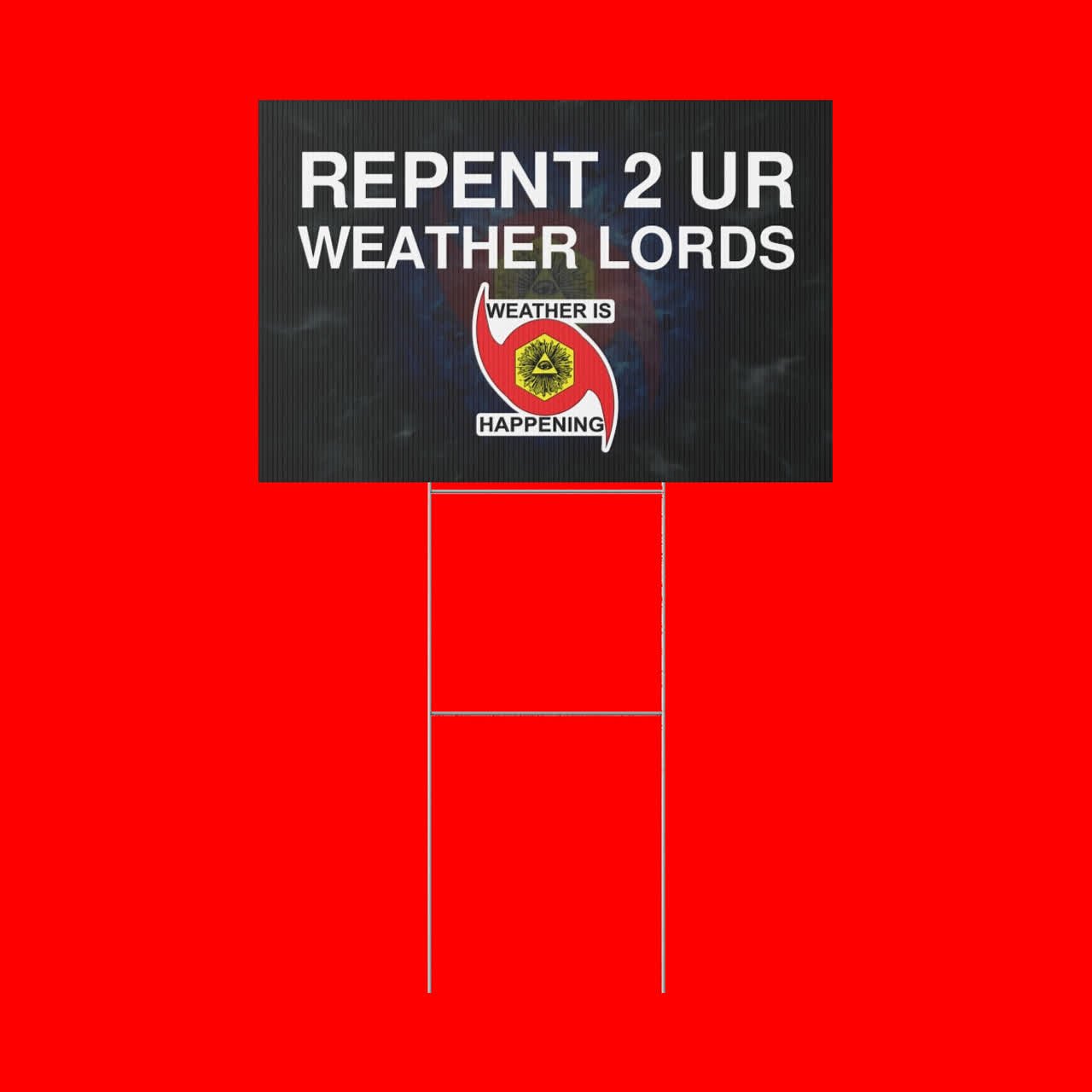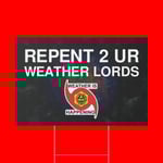 / THIS WEATHER IS HAPPENING PLASTIC YARD SIGN COMMANDS ITS VIEWER 2 REPENT 2 UR WEATHER LORDS